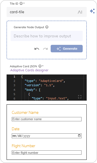 Generate Node Output | Text | A prompt or instruction for generating the adaptive card. To apply the prompt, click Generate. |