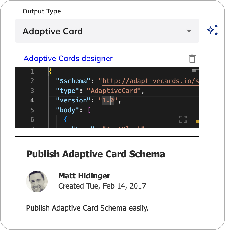 Adaptive Card Designer | JSON | The JSON schema that defines the structure and content of the adaptive card. You can create an adaptive card using the Adaptive Card Designer and then copy and paste the JSON code into the editor. Customize the existing JSON as needed, and if the JSON is valid, the adaptive card will be rendered below the editor. Cognigy.AI supports a limited number of Adaptive Card versions. Using the latest versions may cause compatibility issues. Refer to supported versions for best results. |