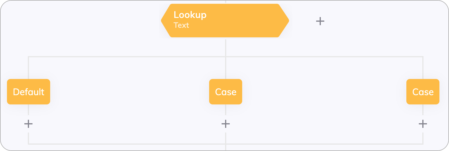 A Lookup Node creates different Flow paths based on a chosen operand. The operand, also called lookup type, can be set to Intent, State, Type and Mode, or custom CognigyScript. In the child Case Nodes, the specific values for the selected operand are entered. The operand is evaluated during the execution of the Flow, and the result is compared with the values of each case. If there is a match, the Flow path of the matched case is executed. If there is no case match, the Default Node is executed.Parameters