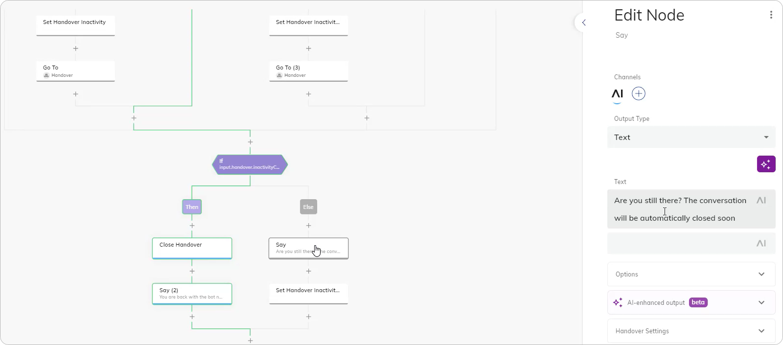 This Node detects and handles user inactivity, freeing up capacity for the human agent team. To configure this Node, specify the time in minutes during which the user can be inactive.Parameters