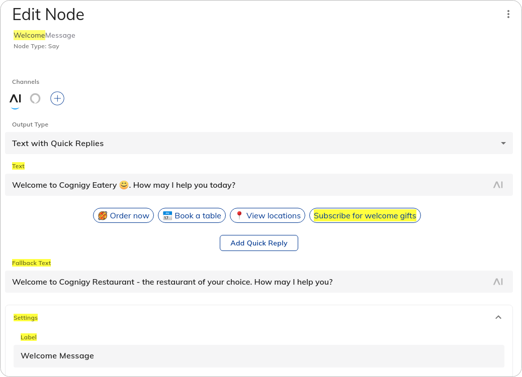 Reference ID | The ID you can use for setting a Node, for example, as an Entrypoint or for manipulating Nodes via the Cognigy.AI API. You can copy the Reference ID from the |