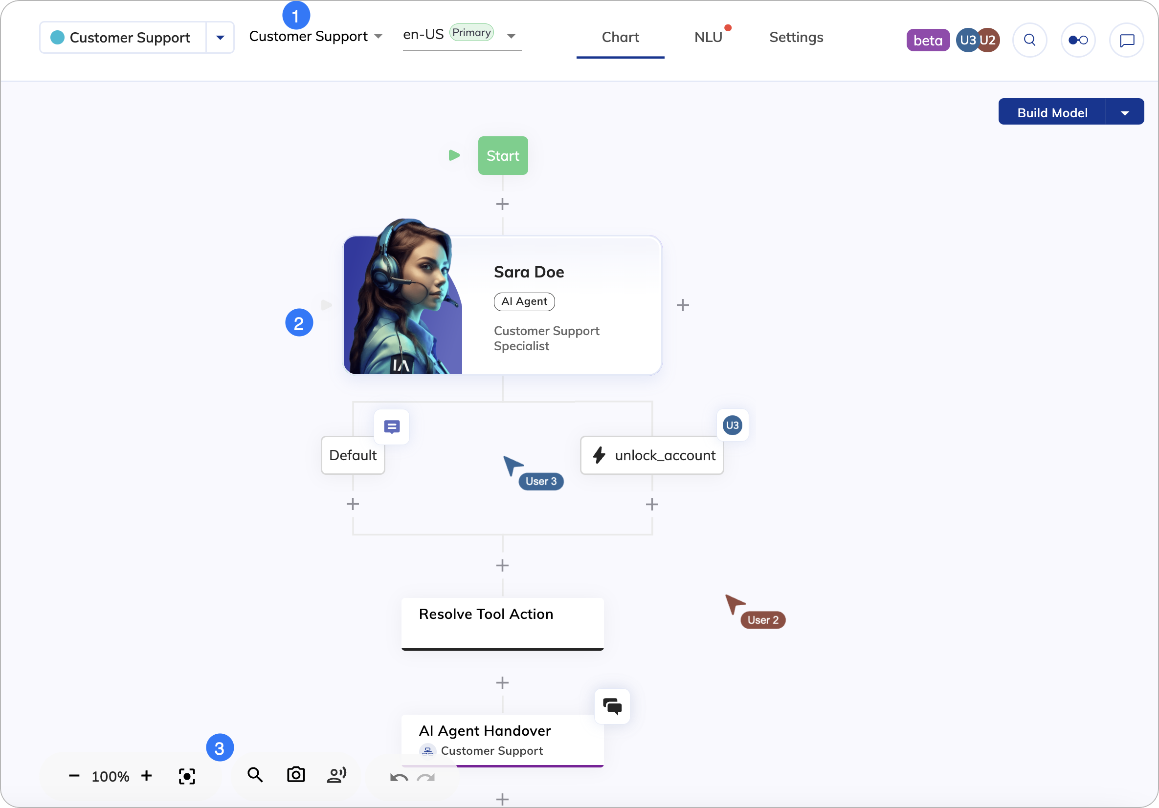 NLU | Tab | Display the NLU settings, where you can configure Intents, States, Slot Fillers, as well as attach Flows and Lexicons. |