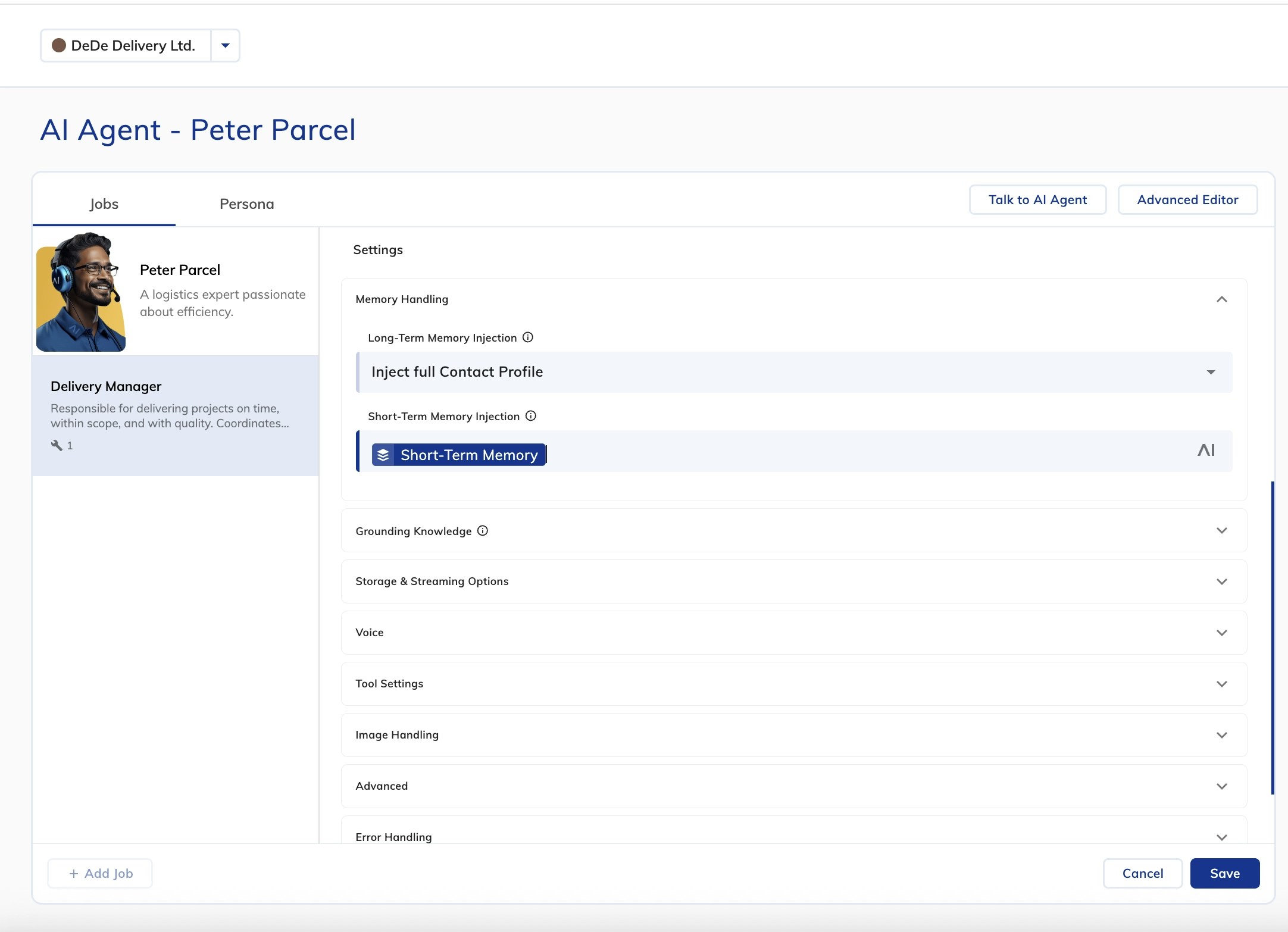To configure short-term memory, in the Memory Handling section, set Long-Term Memory Injection to Inject full Contact Profile.