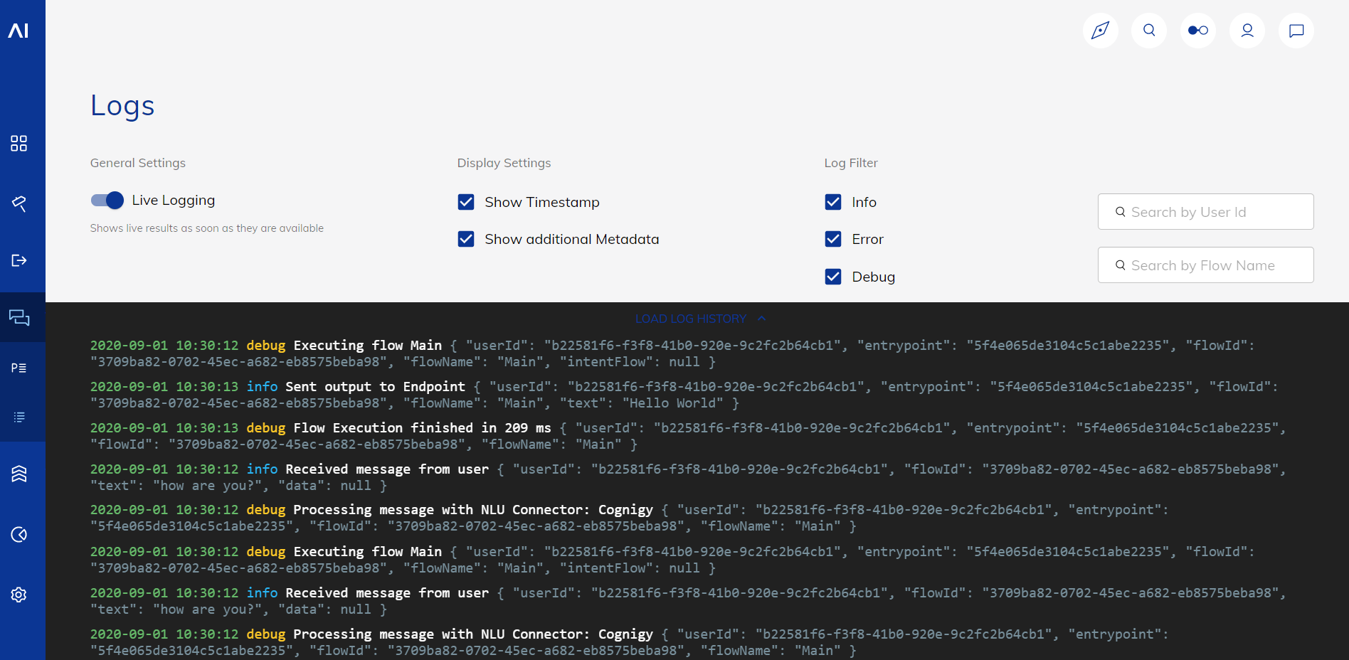 In Test > Logs, you can view and filter Project logs as well as search them by user ID and Flow name.SettingsTo configure the log entries displayed in the log list, use the following settings: