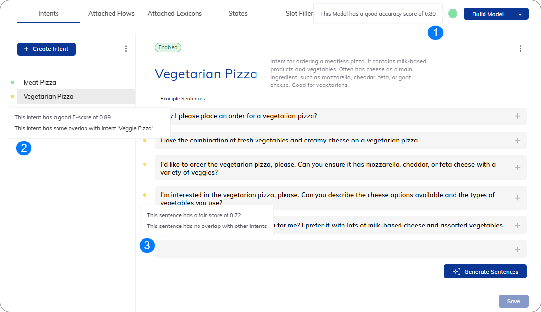 - Individual Example Sentence — each example sentence receives a score based on how effective it is within the NLU model. You can see the score and any overlapping Intents by hovering over the traffic light in the interface.