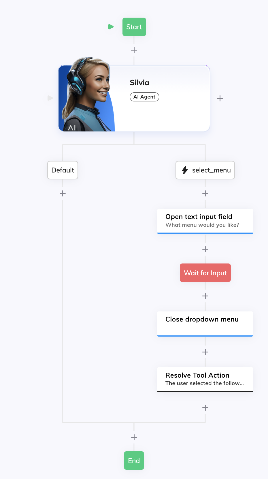 - Add a Wait for Input Node to wait for the user to select or say an option.