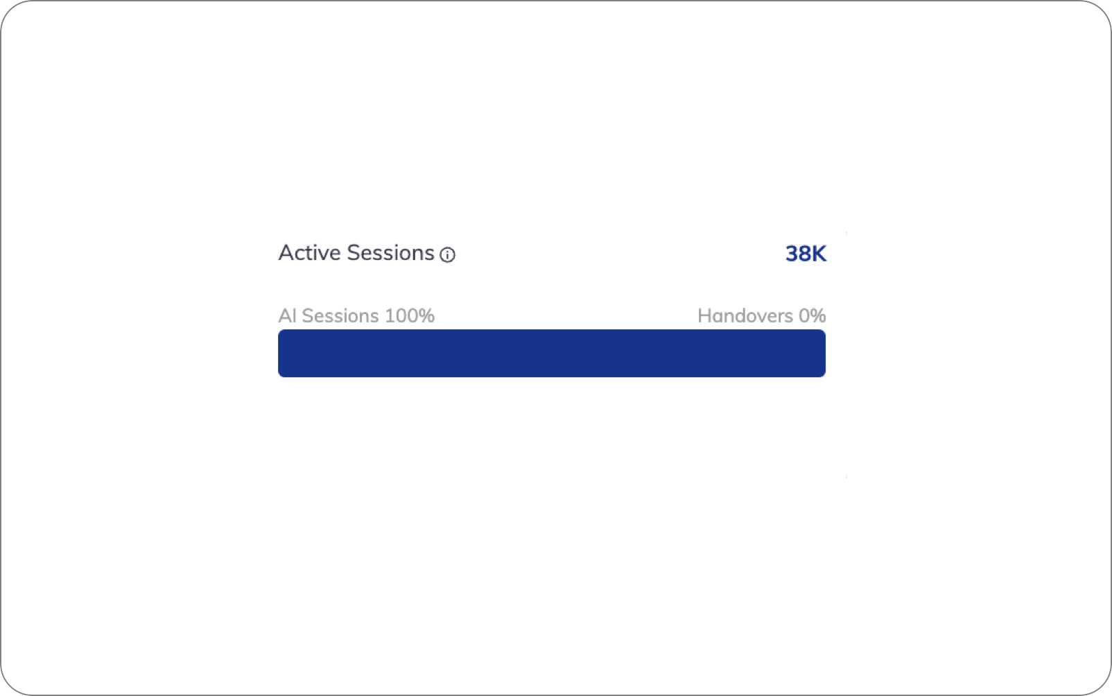 Displays the total number of sessions started within the last 15 minutes, refreshed every 30 seconds. The chart breaks down sessions handled by AI Agents versus those escalated to human agents, enabling you to track how many sessions AI Agents resolved independently.