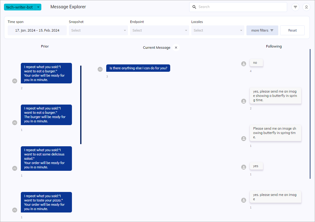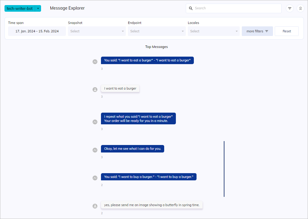 When you first open the Message Explorer with default filter settings, it will scan all sessions of the currently selected AI Agent and display all messages for the selected time span. These messages are titled Top Messages, including user messages and responses from your AI Agent and human agents. The top messages are the ones that are sent most frequently during the specified time span. By default, the only filter applied is the time span set to Last 7 Days. This means that the Message Explorer will first show you the most frequently sent messages from the period you have selected in descending order. The numbers displayed below each message indicate how many times the message has occurred in the selected time span.