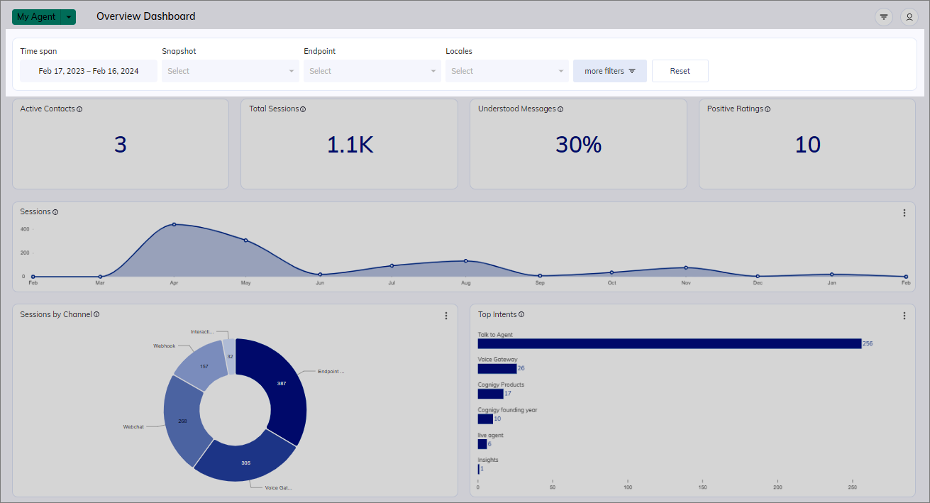 Endpoints serve as connectors. They allow seamless interactions between Cognigy AI Agents and external systems or platforms. Examples of Endpoints include Webchat, Voice Gateway, and Microsoft Teams. For more information, read the Endpoints documentation. You can select one or more Endpoints to be analyzed. To use the Endpoints filter, proceed as follows:- At the top of the Insights interface, go to the filter bar.
