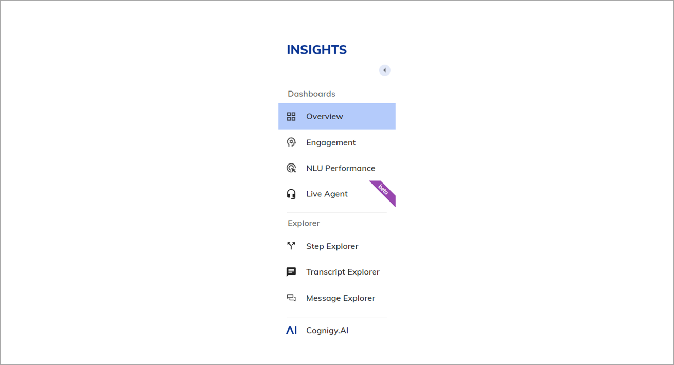The Insights left-side menu displays all available reports and explorers. This menu allows you to easily switch between different reports and explorers to analyze your AI Agent’s performance. You can always identify the currently selected view in two ways: it’s highlighted in light blue-gray in the menu bar and displayed in the header at the top of your screen. The left-side menu also allows you to switch back to Cognigy.AI by clicking Cognigy.AI.