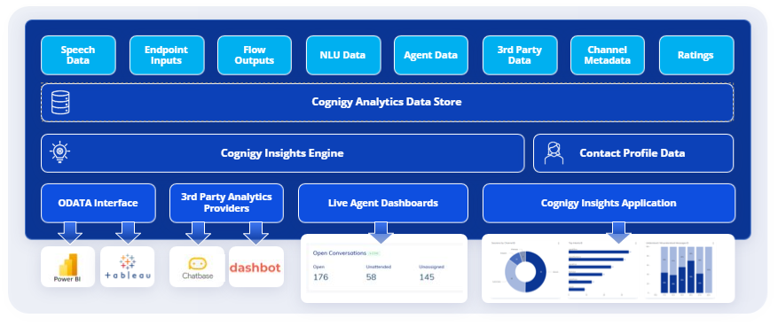 - Cognigy.AI OData Endpoint. Allows access to raw data through APIs and is highly customizable, making it suitable for integration with BI tools and creating custom reports. For more information about the OData endpoint, read the Cognigy.AI OData Analytics Endpoint documentation.