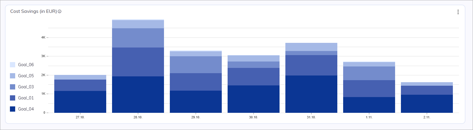 Displays the amount of the money saved for each goal completed within the selected time span. You can analyze cost savings across different goals, identify the most cost-effective processes, and optimize resource allocation. Source table: