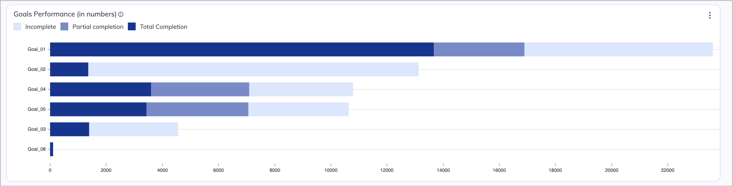 Displays the number of goals achieved within the selected time span. The goals have three distinct categories, each has a separate bar:- Incomplete — goals that have been started, with only the initial step triggered.