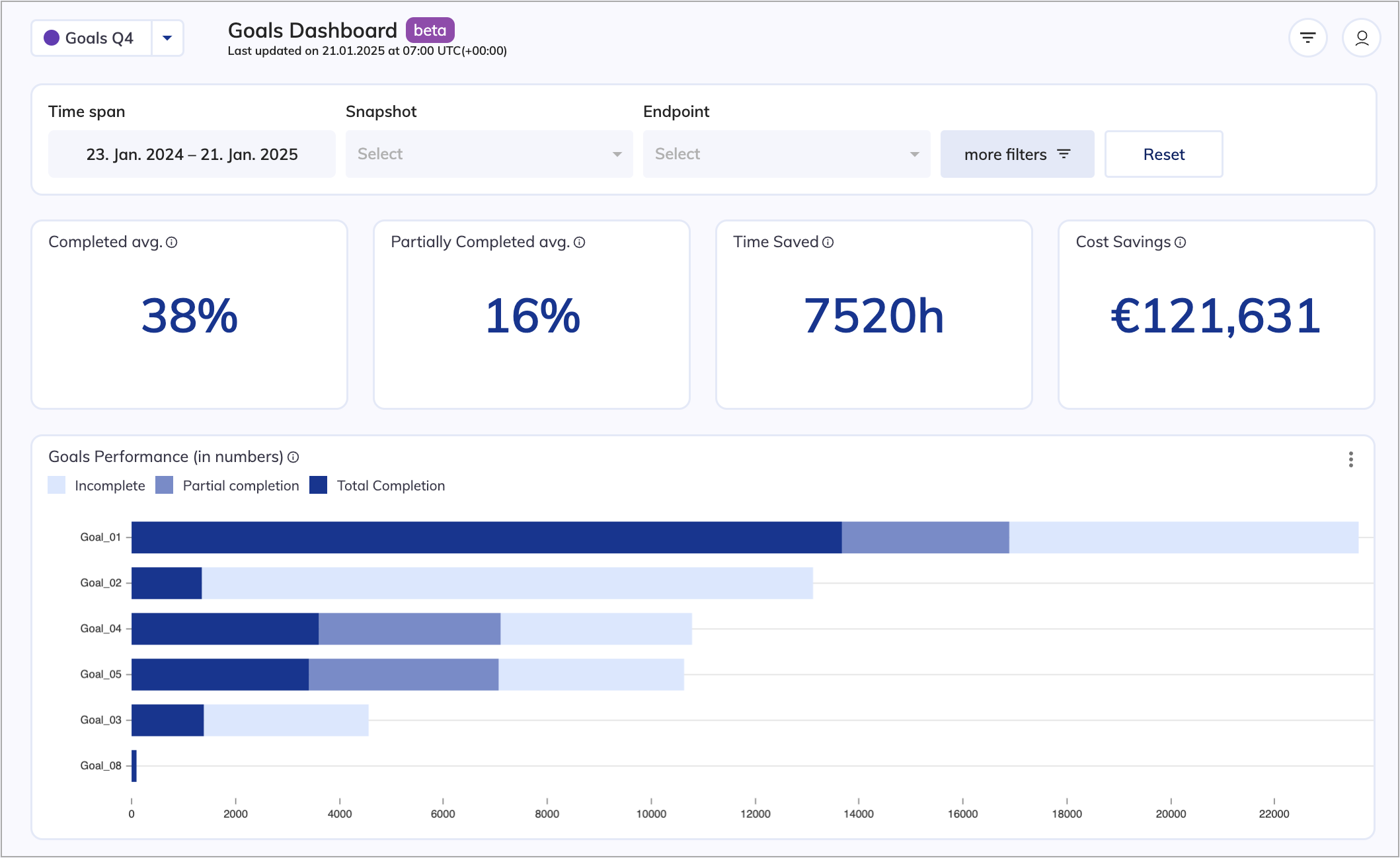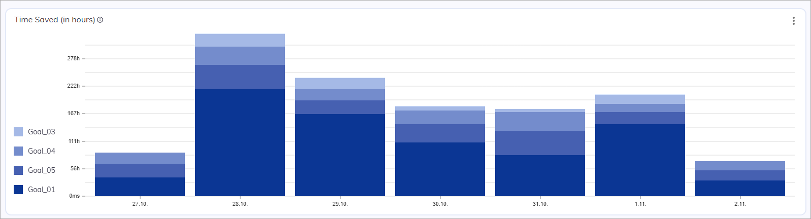Displays time saved in hours for each goal that was completed within the filtered time span. You can track efficiency gains and compare time saved across different goals. Source table: