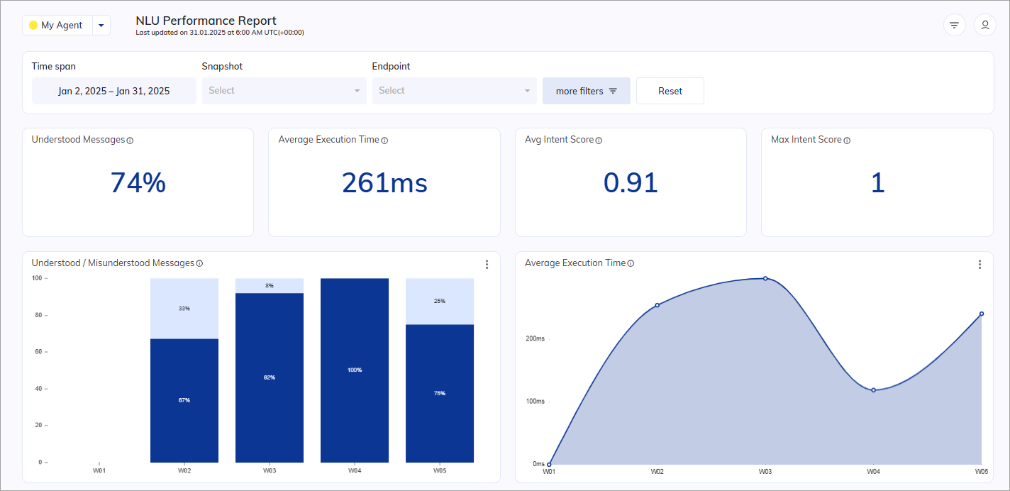 Displays the average Intent score for the selected time span. Higher Intent scores indicate better AI Agent performance in matching user queries. For more information, see Machine Learning Intents. To find the average intent score, Insights sums up all the intent scores and divides the sum by the total number of records. Source table:- Sum of Intent Scores =