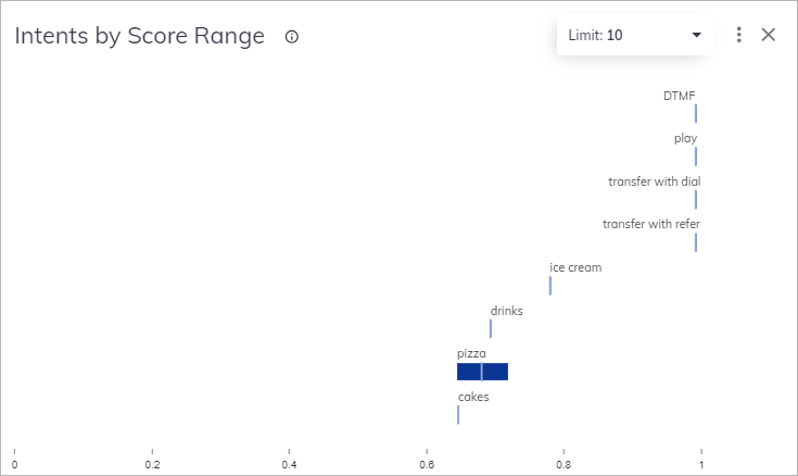 Displays the scoring range of matched Intents. Each score range is displayed as a bar with minimum, maximum, and average values. Clicking on the three-dots menu item, you can select the Go to Intent Trainer that leads you to the application in Cognigy.AI to improve your Flow. For more information, see Intent Trainer. Source table:
