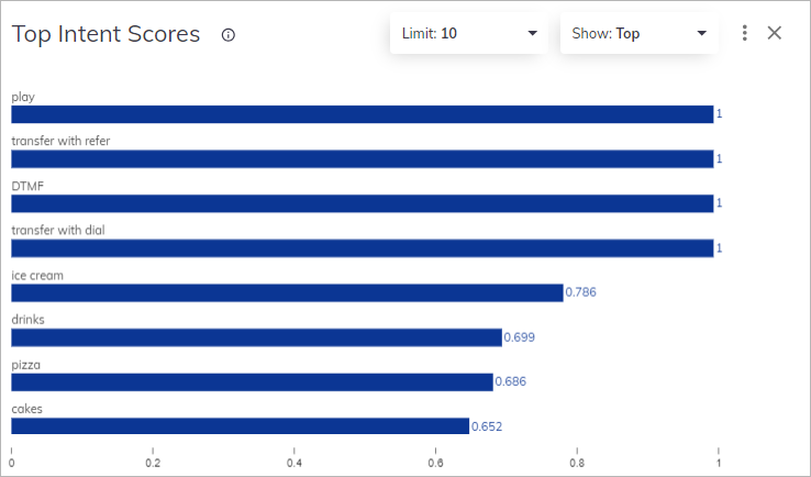 Indicates the top-rated numbers of Intents displayed in a bar chart. For more information, see Intent Analyzer. Source table:- Intent Score Max: