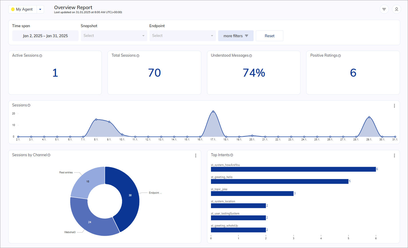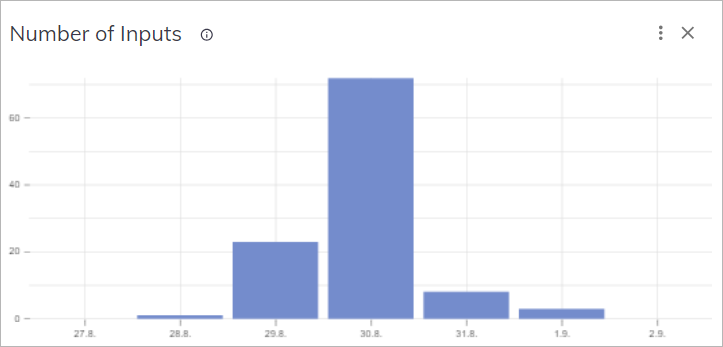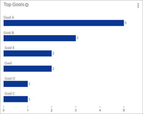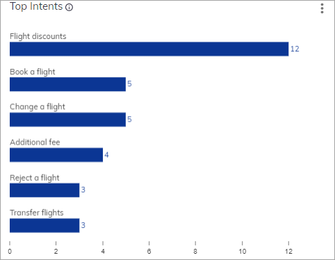 Indicates the top-rated number of used intents, displayed in a horizontal bar chart. The chart showcases the top-rated number of intents used, with a maximum of 6 intents shown in the summary view and 25 in the detailed view. Whenever an intent is matched, it is recorded in the analytics data. The data is then grouped by the matched intent and sorted in descending order. Source table:
