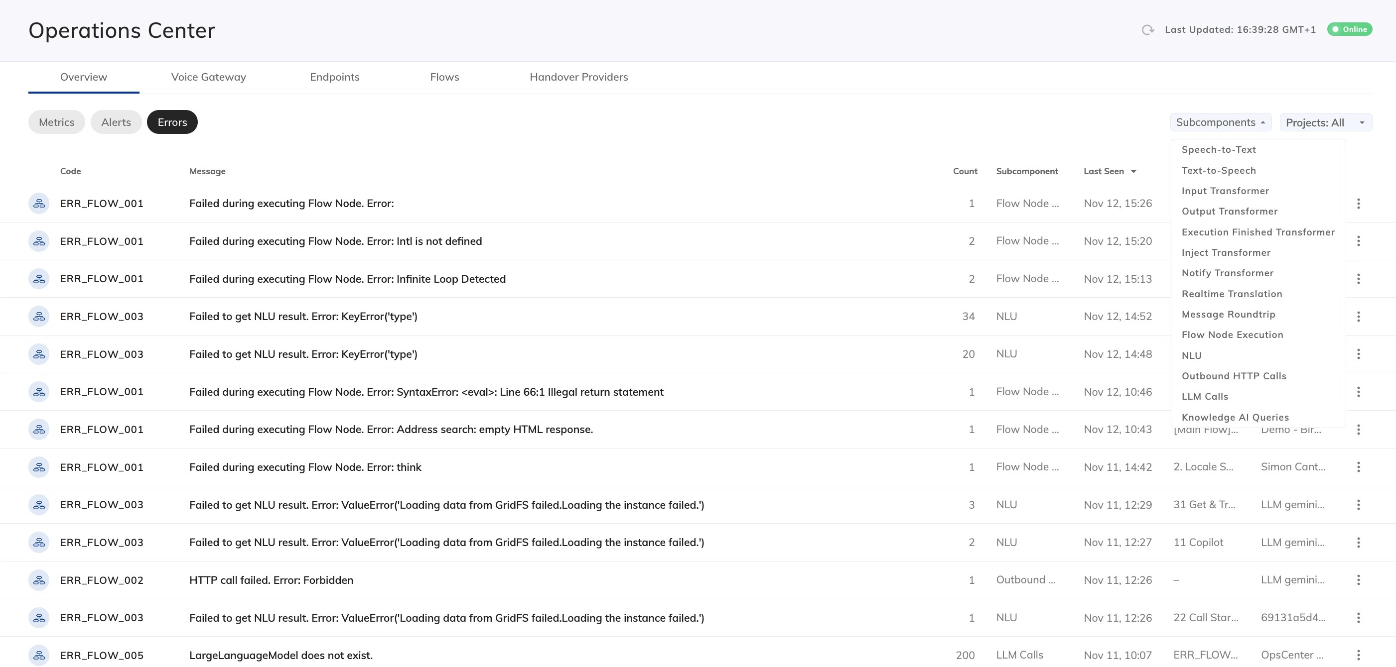 A Component is a Cognigy.AI product, feature, resource, or service that can be part of the conversation lifecycle. Ops Center tracks components to provide information about the health of your AI Agents operation. Ops Center tracks the following components:Subcomponents