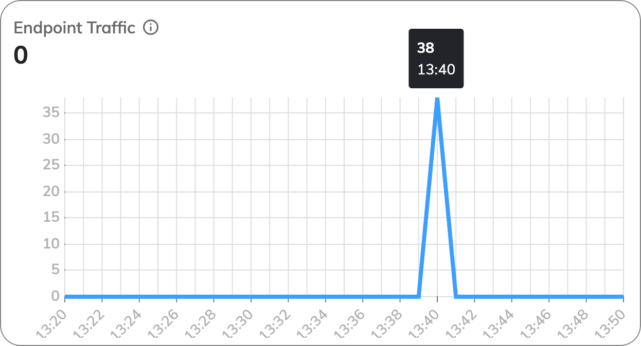 This chart tracks the volume of traffic (requests) handled by each Endpoint. A sudden increase or decrease can indicate changes in system demand or issues with Endpoint availability.Look at the peak in the chart, which indicate end-user activity in the Endpoints. This means that 38 user inputs were sent through the Endpoints per minute.