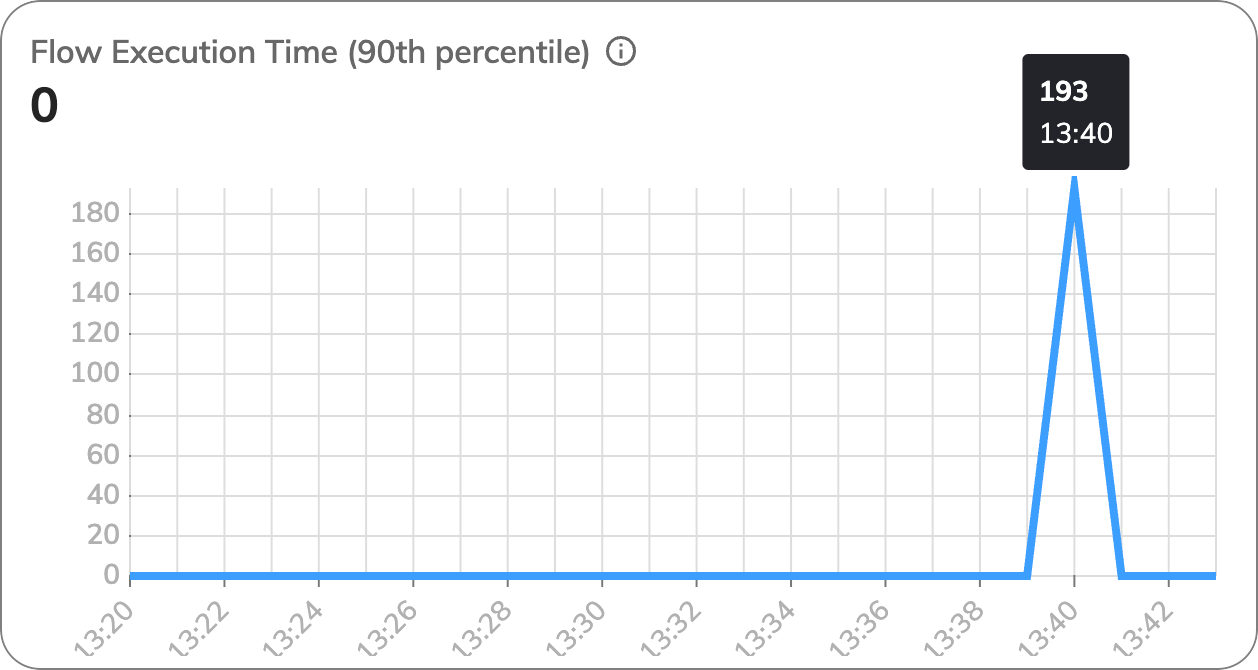 This chart shows the distribution of Flow execution times, focusing on the 90th percentile. The 90th percentile indicates the time below which 90% of your Flows finish. In this case, the 90th percentile is 193 milliseconds (ms), meaning 90% of Flows completed in 193 ms or less, which suggests good performance.