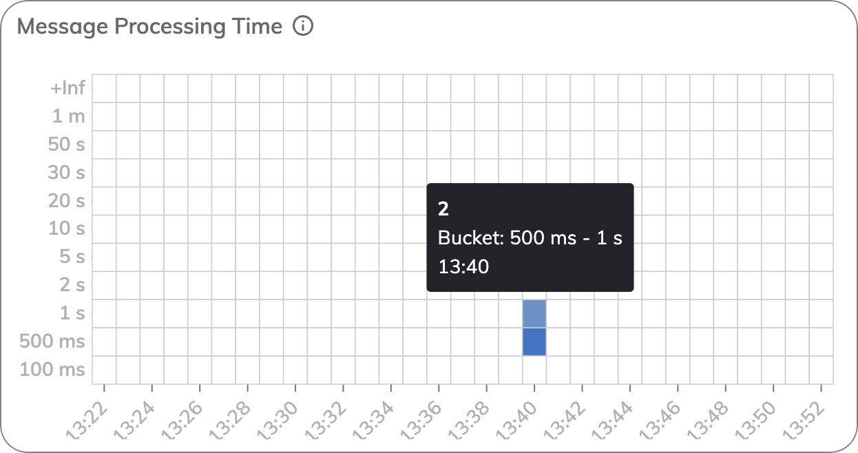 This chart tracks the time it takes to process each user input at the Endpoint. Monitoring this metric helps identify delays in message handling, potentially pointing to performance bottlenecks in your Flows or external services.The chart shows that at 9:03, there were 38 user inputs with processing times falling within the 100–500 millisecond time range.