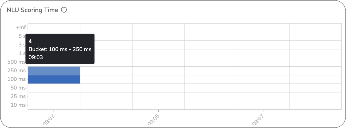 This chart tracks the time taken by the Natural Language Understanding (NLU) component to score user inputs. Longer scoring times may indicate that the NLU model is struggling to process certain inputs efficiently, potentially due to complex queries or system load.The chart shows that at 9:03, there were 28 user inputs with scoring times falling within the 50–100 millisecond time range.