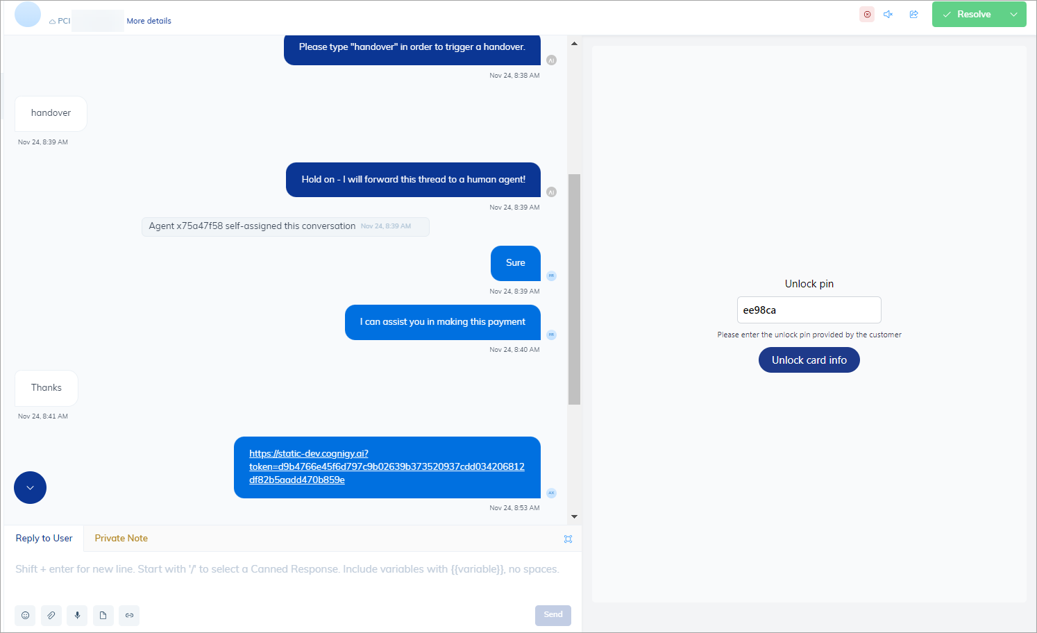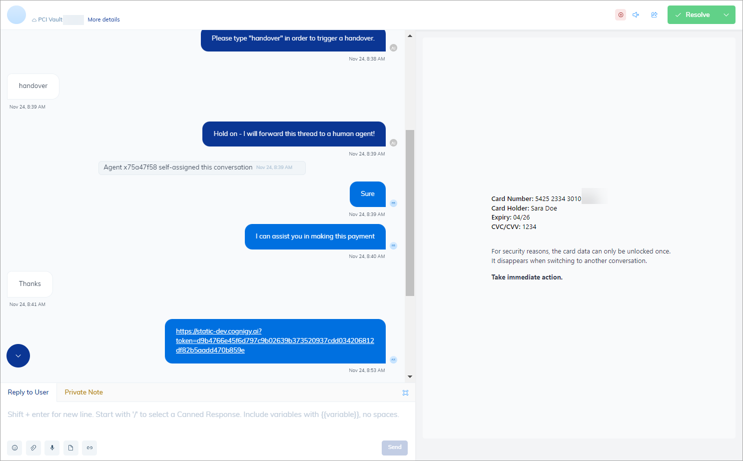 - If the user successfully submits the data, the human agent in the Agent Copilot workspace will receive the card details. For security reasons, the card data can only be unlocked once and will disappear when switching to another conversation. The human agent must take immediate action.