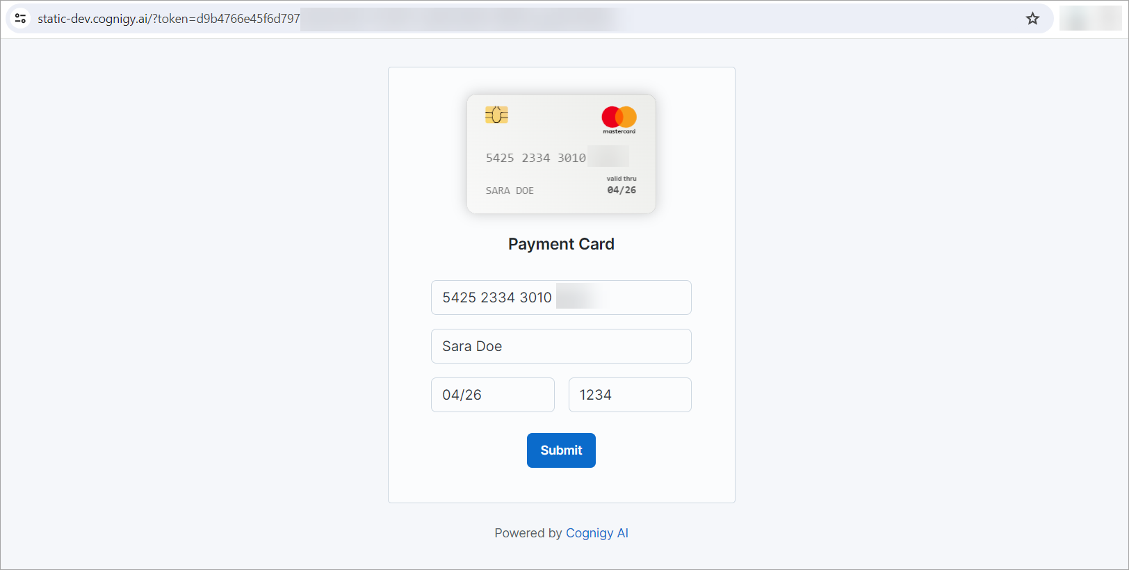 - The end user accesses the secure form through the provided link, enters sensitive payment information, and submits it.