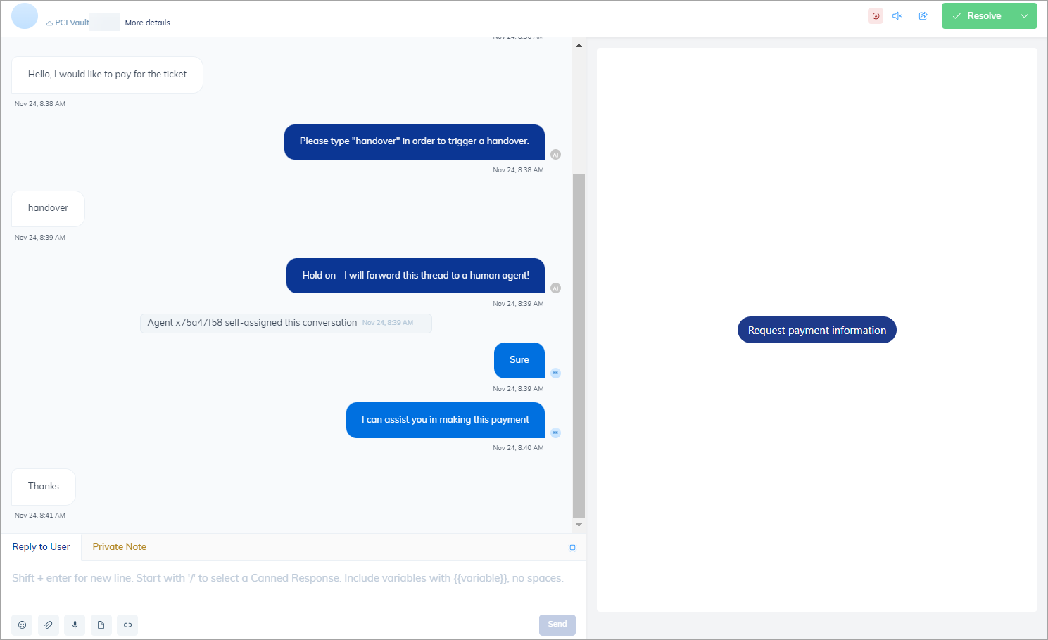 To empower your human agents to securely access end user credit card data via PCI Vault, configuration of the following resources is a prerequisite:- A Flow using the Handover to Agent Flow Node to initiate a handover to a human agent.