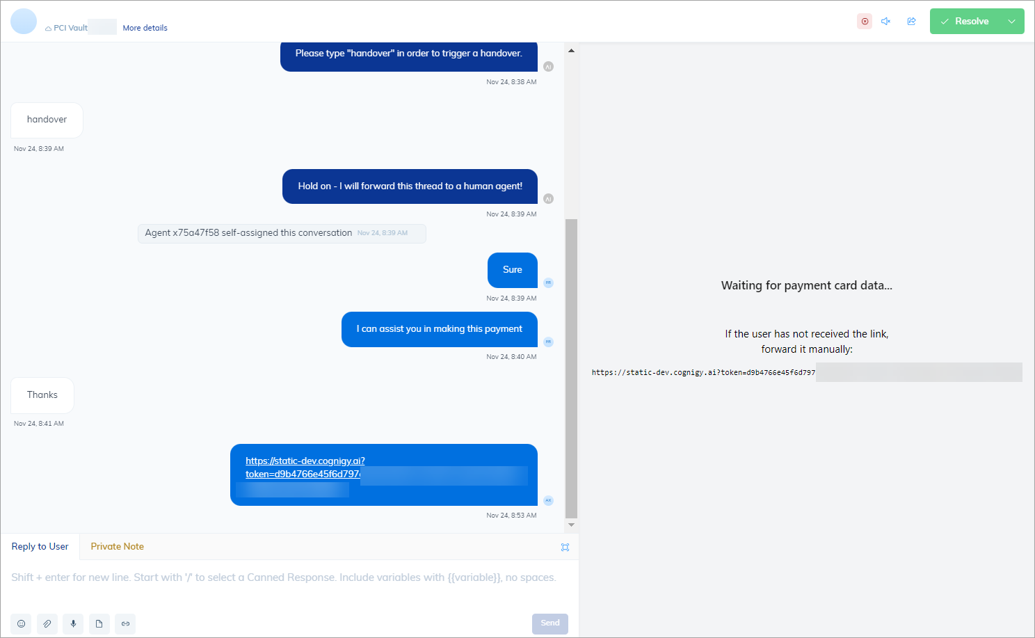 - When the human agent clicks this button, a link for entering card details will be generated and sent to the chat. If the link is not received, the human agent can forward it manually.