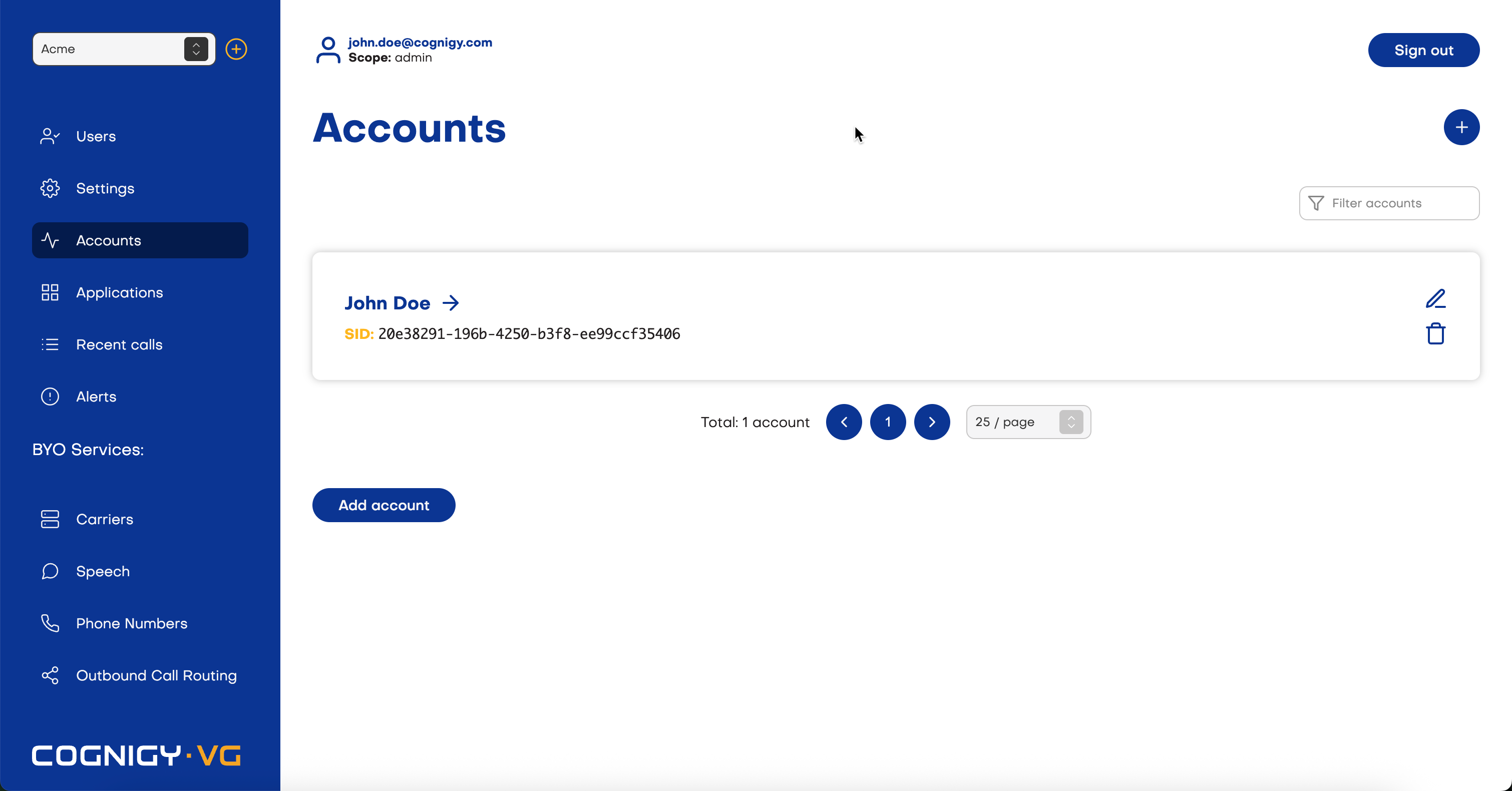 When the Call recording feature is enabled at the account level, calls from all applications within an account will be recorded. To enable recording calls at an account level, follow these steps:- In the left-side menu of the Voice Gateway Self-Service Portal, select Accounts.