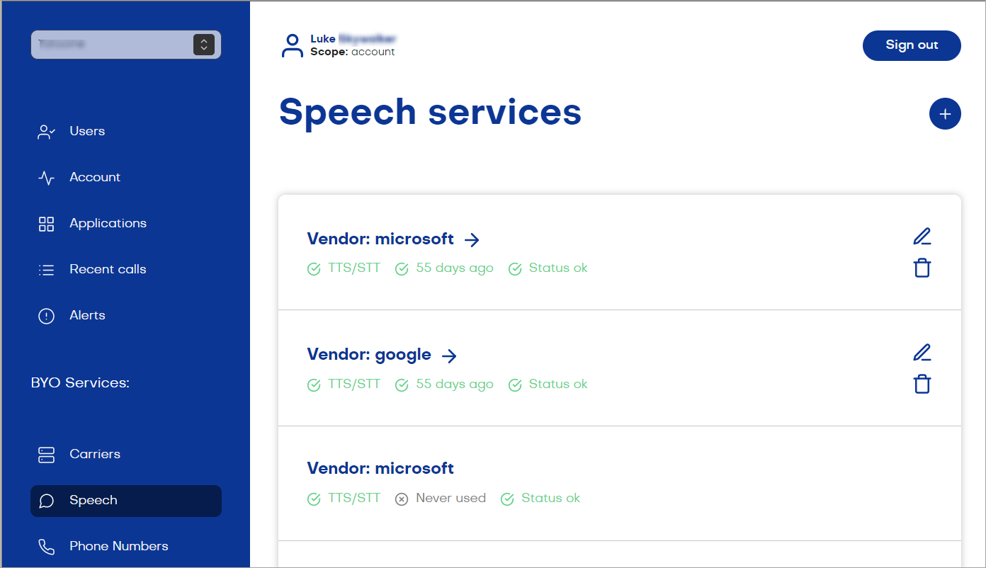 - Click Add Speech Service and select your preferred vendor.