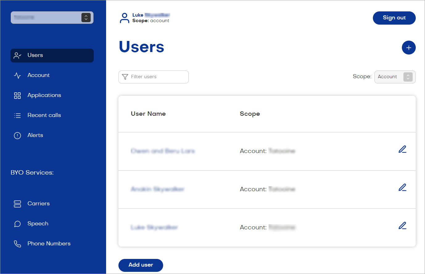 Updated in 4.62 This scope includes basic operations with Voice Gateway entities, such as creating, editing, and deleting entities. It also allows for editing user profiles, carriers, and speech services that belong to users with the Account scope. Users with the Account role can be authorized in the Voice Gateway Self-Service Portal via their Cognigy.AI user credentials. To activate this option, you need to activate the Set up Voice Gateway button in the User menu > Admin Center of the Cognigy.AI UI. Go to User Menu > Admin Center > Access Control and add avoice-gatewayUser role for selected users.