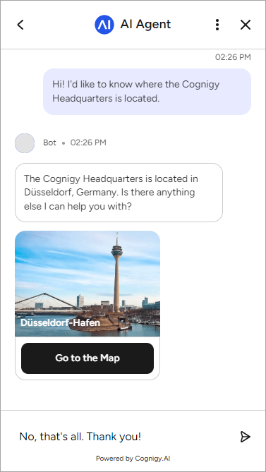 The Cognigy Headquarters is located in Düsseldorf, Germany. Is there anything else I can help you with? - Click Save Node.