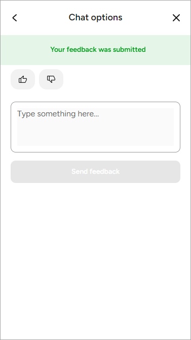 - After submitting feedback, a notification about the sent message will appear at the top of the window. The user can give feedback an unlimited number of times. Return to the conversation you started or view earlier conversations on the home screen. For navigation, use the < button in the upper-left corner of the screen.