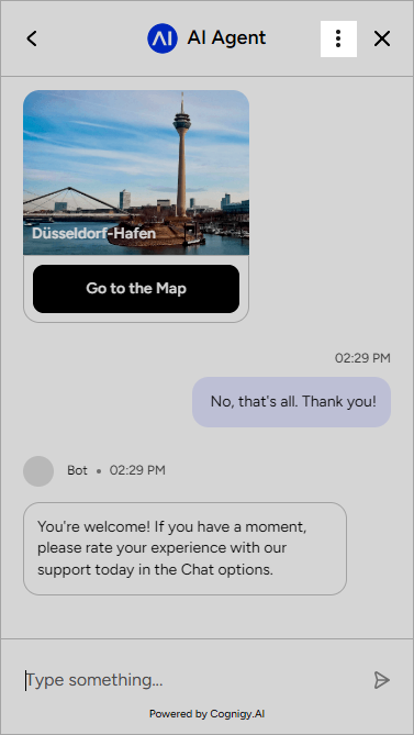 - The agent sends you the answer, which contains the location and a link to the map, and asks if further assistance is needed. Send the following message as a reply: