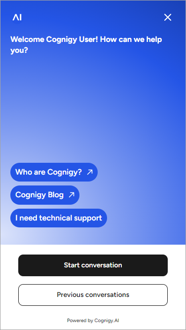 Welcome Cognigy User! How can we help you? - In the Conversation Starters section, activate Enable Conversation Starters and click Add.