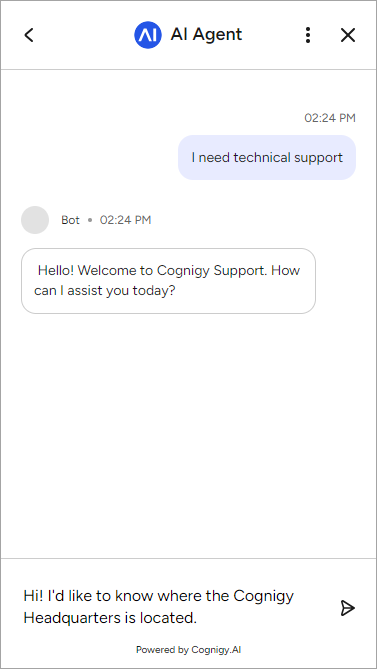 - Click the button I need technical Support that triggers a conversation with the AI Agent.