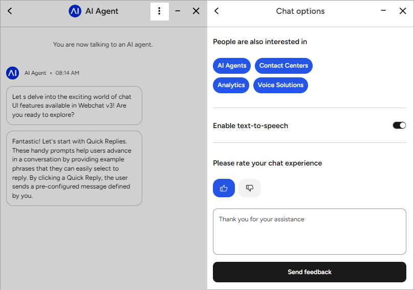 The Quick Replies feature at the top of the Chat Option screen simplifies interactions by offering instant responses or directing users to more information. Users can easily choose from these options to address common questions or navigate to additional resources. To configure the quick replies, refer to the Quick Replies settings.Text-to-Speech