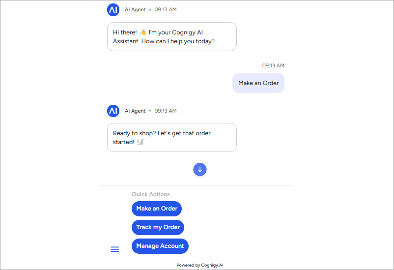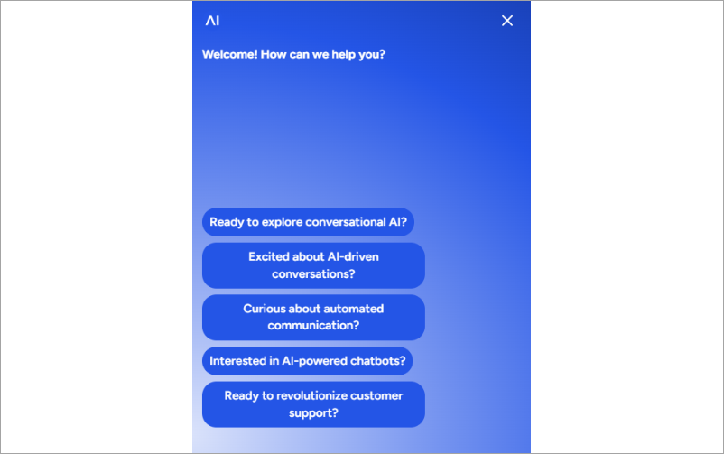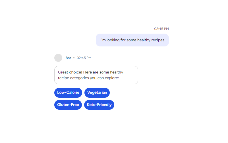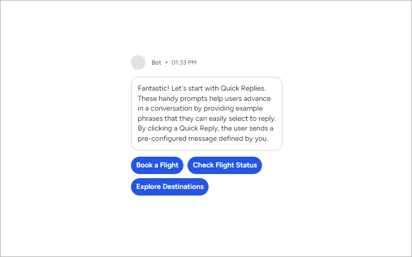 With Quick Replies, you can guide users through conversations by offering example phrases for replies. When users click a Quick Reply, they’ll send a pre-configured message defined by you, facilitating smoother interactions.