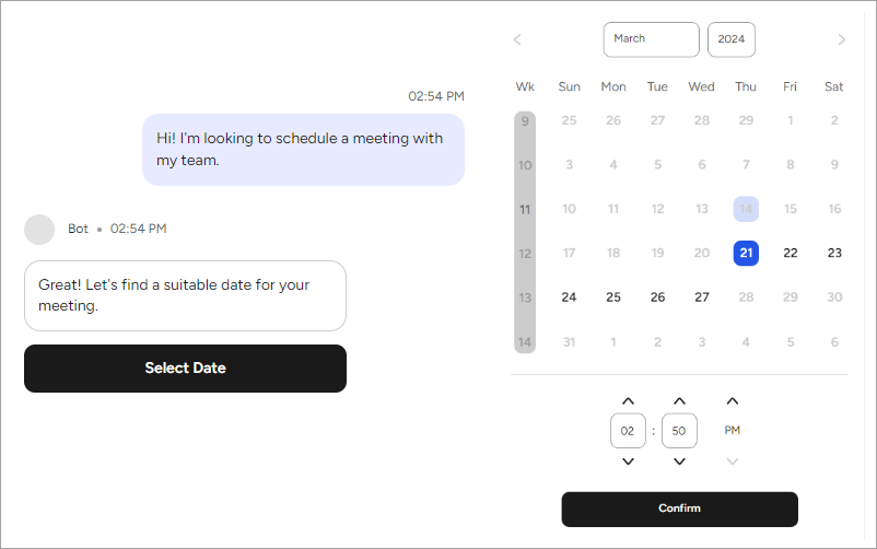 Whenever your AI Agent prompts for a date input via the Webchat, users can select the date using an interactive Date Picker. After clicking the Date Picker button, a full-screen overlay will appear in the Webchat, allowing the user to choose a date within the constraints defined by the AI Agent.