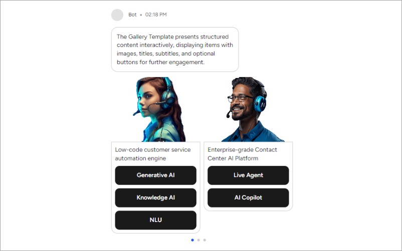 To present structured content interactively, use the Gallery. It allows you to showcase one or more items with an image, a title, a subtitle, and optional buttons containing links or pre-configured messages.