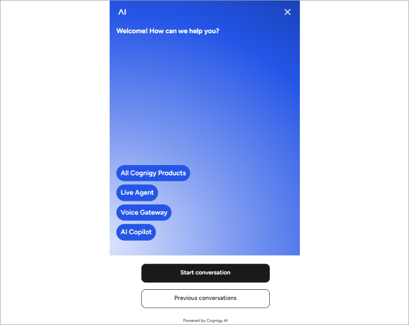 Customization includes a comprehensive suite of features that bolster your brand’s presence and enhance user accessibility. Customize the chat interface with your brand’s title and logo, alongside distinct avatars for both AI and human agents, and adjust the color scheme across various elements. Accessibility is prioritized with Text-to-Speech and Speech-to-Text functionalities. Starting behavior customization sets the tone for engagement, allowing for a tailored initial interaction, such as a greeting message or a start button. Operational settings, including business hours, ensure users are clearly informed about the availability of support. Collectively, these customization options create a personalized and efficient webchat experience that aligns with your operational requirements and brand image. For customization, refer to the Webchat Layout and Webchat Behavior settings.Home Screen