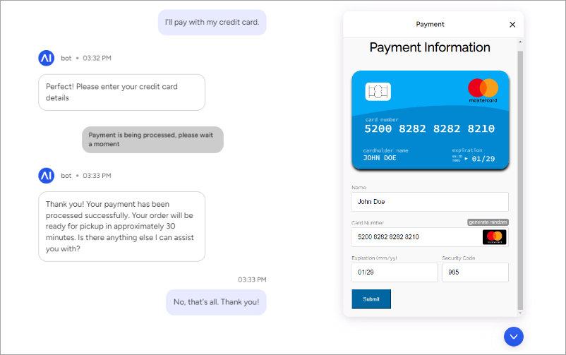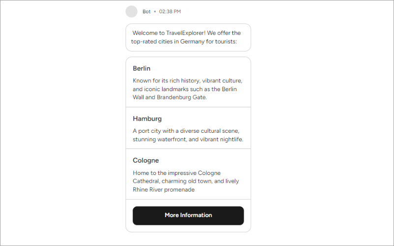 Customizable Adaptive Cards are a valuable feature in the chat interface, especially for gathering user information. These interactive elements can be customized to collect specific details or preferences from users in a structured and user-friendly manner. Their adaptability ensures seamless integration with the chat’s design, maintaining brand consistency while enhancing the user experience.