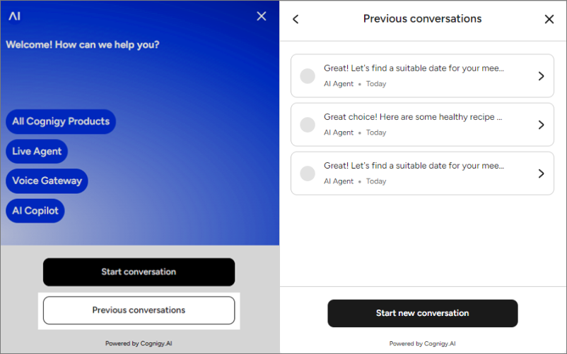 The Previous Conversations feature offers a straightforward way for users to access their past dialogues with the AI Agent directly from the Webchat home screen. It includes options to customize the Previous Conversations button text, and the header of the conversation screen, enriching user experience by ensuring continuity and easy reference to previous interactions.