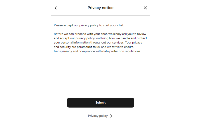 The Privacy Notice feature ensures user trust and compliance by prompting consent to a privacy notice before chatting with the AI Agent. It includes customization of the title, detailed message, and submit button text, as well as a direct link to the full Privacy Policy, transparently informing users about data handling practices and securing their informed consent. Cognigy.AI automatically records user acceptance of the Privacy Notice in the Contact Profile.