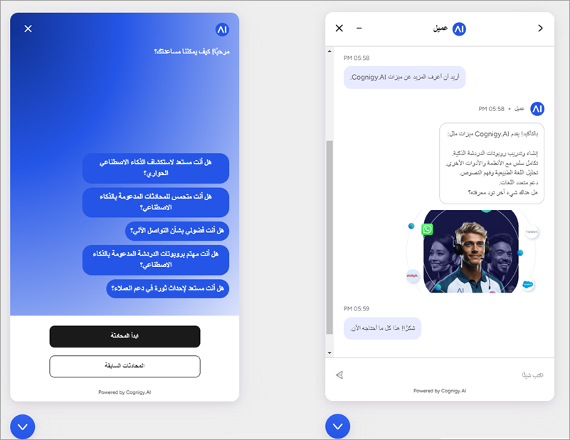 Alongside the traditional left-to-right (LTR) layout, Webchat v3 supports right-to-left (RTL). This feature is especially beneficial for languages such as Arabic, Persian (Farsi), Hebrew, Urdu, and other languages that use this writing direction. Supporting RTL layouts lets users from various regions interact with the Webchat widget in their native languages that enhances the user experience and leads to more effective and personalized interactions with the AI Agent. All elements of the Webchat widget are aligned for RTL, including the positioning of the widget itself, which now appears in the bottom-left corner of the web page. This adjustment ensures that users who speak languages with a right-to-left writing direction can easily interact with the chat, as it aligns with their usual reading and writing patterns.